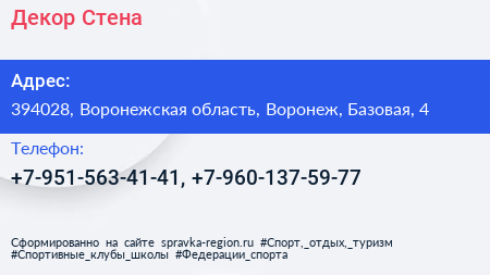 Декор Стена по адресу 394028, Воронежская область, Воронеж, Базовая, 4 в дальнейшем Организация, размещена в следующих категориях: