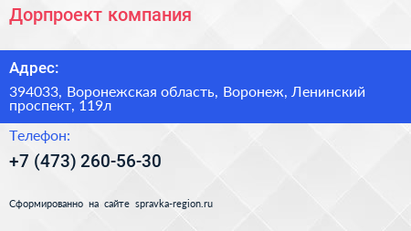 Дорпроект, компания по адресу 394033, Воронежская область, Воронеж, Ленинский проспект, 119л в дальнейшем Организация, размещена в следующих категориях:
