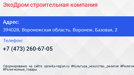 ЭкоДром, строительная компания по адресу 394028, Воронежская область, Воронеж, Базовая, 2 в дальнейшем Организация, размещена в следующих категориях: