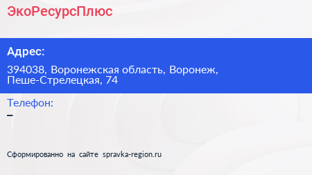 ЭкоРесурсПлюс по адресу 394038, Воронежская область, Воронеж, Пеше-Стрелецкая, 74 в дальнейшем Организация, размещена в следующих категориях: