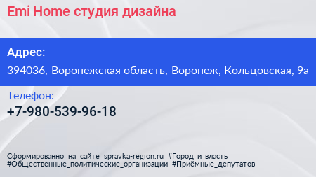 Emi Home, студия дизайна по адресу 394036, Воронежская область, Воронеж, Кольцовская, 9а в дальнейшем Организация, размещена в следующих категориях: