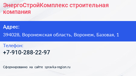 ЭнергоСтройКомплекс, строительная компания по адресу 394028, Воронежская область, Воронеж, Базовая, 1 в дальнейшем Организация, размещена в следующих категориях: