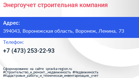 Энергоучет, строительная компания по адресу 394043, Воронежская область, Воронеж, Ленина, 73 в дальнейшем Организация, размещена в следующих категориях:
