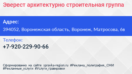 Эверест, архитектурно-строительная группа по адресу 394052, Воронежская область, Воронеж, Матросова, 6в в дальнейшем Организация, размещена в следующих категориях: