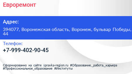Евроремонт по адресу 394077, Воронежская область, Воронеж, бульвар Победы, 44 в дальнейшем Организация, размещена в следующих категориях:
