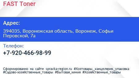 FAST Toner по адресу 394035, Воронежская область, Воронеж, Софьи Перовской, 7а в дальнейшем Организация, размещена в следующих категориях: