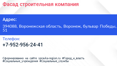 Фасад, строительная компания по адресу 394088, Воронежская область, Воронеж, бульвар Победы, 51 в дальнейшем Организация, размещена в следующих категориях:
