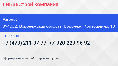 ГНБ36Строй, компания по адресу 394052, Воронежская область, Воронеж, Кривошеина, 13 в дальнейшем Организация, размещена в следующих категориях: