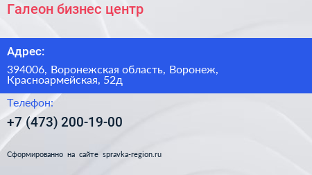 Галеон, бизнес-центр по адресу 394006, Воронежская область, Воронеж, Красноармейская, 52д в дальнейшем Организация, размещена в следующих категориях: