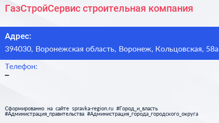 ГазСтройСервис, строительная компания по адресу 394030, Воронежская область, Воронеж, Кольцовская, 58а в дальнейшем Организация, размещена в следующих категориях: