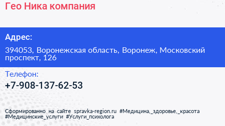 Гео-Ника, компания по адресу 394053, Воронежская область, Воронеж, Московский проспект, 126 в дальнейшем Организация, размещена в следующих категориях: