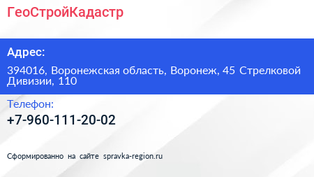 ГеоСтройКадастр по адресу 394016, Воронежская область, Воронеж, 45 Стрелковой Дивизии, 110 в дальнейшем Организация, размещена в следующих категориях: