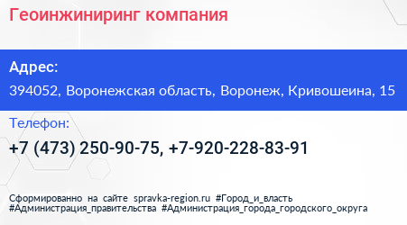 Геоинжиниринг, компания по адресу 394052, Воронежская область, Воронеж, Кривошеина, 15 в дальнейшем Организация, размещена в следующих категориях: