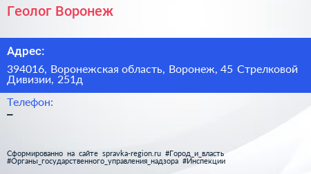 Геолог-Воронеж по адресу 394016, Воронежская область, Воронеж, 45 Стрелковой Дивизии, 251д в дальнейшем Организация, размещена в следующих категориях: