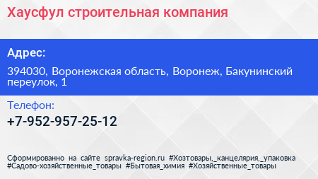 Хаусфул, строительная компания по адресу 394030, Воронежская область, Воронеж, Бакунинский переулок, 1 в дальнейшем Организация, размещена в следующих категориях: