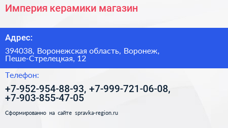 Империя керамики, магазин по адресу 394038, Воронежская область, Воронеж, Пеше-Стрелецкая, 12 в дальнейшем Организация, размещена в следующих категориях: