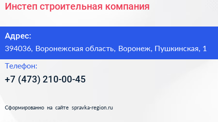 Инстеп, строительная компания по адресу 394036, Воронежская область, Воронеж, Пушкинская, 1 в дальнейшем Организация, размещена в следующих категориях: