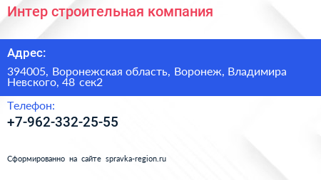 Интер, строительная компания по адресу 394005, Воронежская область, Воронеж, Владимира Невского, 48 сек2 в дальнейшем Организация, размещена в следующих категориях: