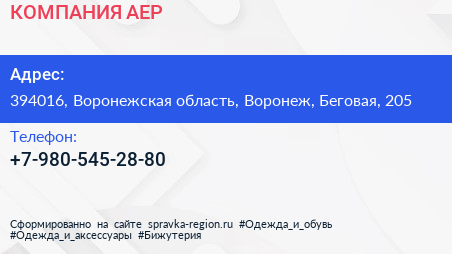 КОМПАНИЯ АЕР по адресу 394016, Воронежская область, Воронеж, Беговая, 205 в дальнейшем Организация, размещена в следующих категориях: