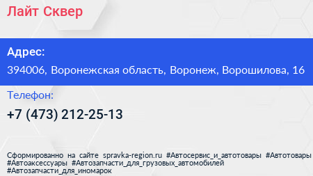 Лайт Сквер по адресу 394006, Воронежская область, Воронеж, Ворошилова, 16 в дальнейшем Организация, размещена в следующих категориях: