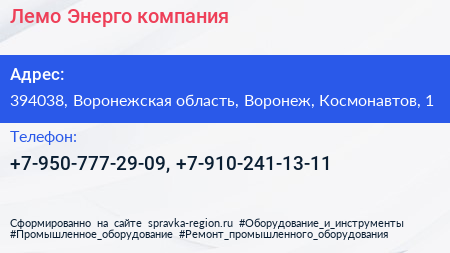 Лемо-Энерго, компания по адресу 394038, Воронежская область, Воронеж, Космонавтов, 1 в дальнейшем Организация, размещена в следующих категориях: