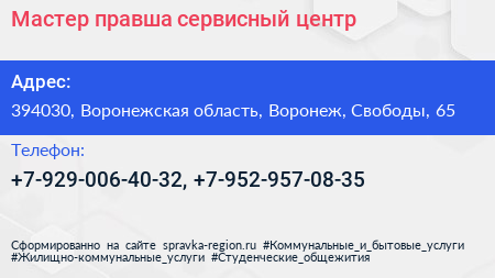Мастер правша, сервисный центр по адресу 394030, Воронежская область, Воронеж, Свободы, 65 в дальнейшем Организация, размещена в следующих категориях: