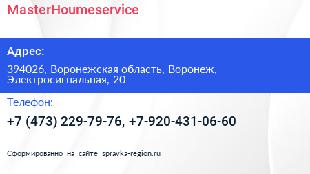 MasterHoumeservice по адресу 394026, Воронежская область, Воронеж, Электросигнальная, 20 в дальнейшем Организация, размещена в следующих категориях: