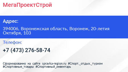 МегаПроектСтрой по адресу 394006, Воронежская область, Воронеж, 20-летия Октября, 103 в дальнейшем Организация, размещена в следующих категориях:
