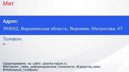 Мит по адресу 394052, Воронежская область, Воронеж, Матросова, 47 в дальнейшем Организация, размещена в следующих категориях: