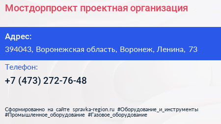 Мостдорпроект, проектная организация по адресу 394043, Воронежская область, Воронеж, Ленина, 73 в дальнейшем Организация, размещена в следующих категориях: