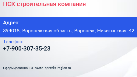 НСК, строительная компания по адресу 394018, Воронежская область, Воронеж, Никитинская, 42 в дальнейшем Организация, размещена в следующих категориях:
