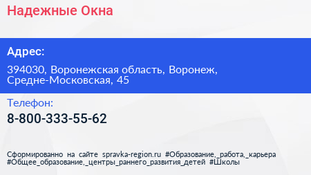 Надежные Окна по адресу 394030, Воронежская область, Воронеж, Средне-Московская, 45 в дальнейшем Организация, размещена в следующих категориях: