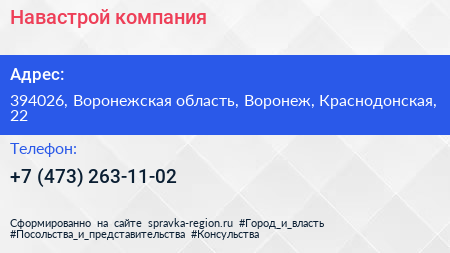 Навастрой, компания по адресу 394026, Воронежская область, Воронеж, Краснодонская, 22 в дальнейшем Организация, размещена в следующих категориях: