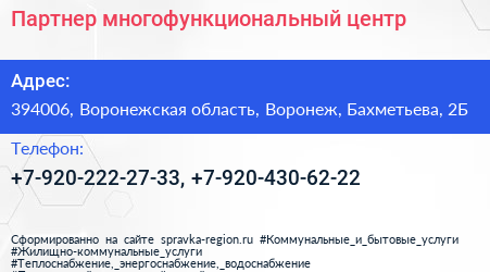 Партнер, многофункциональный центр по адресу 394006, Воронежская область, Воронеж, Бахметьева, 2Б в дальнейшем Организация, размещена в следующих категориях:
