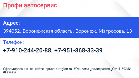 Профи, автосервис по адресу 394052, Воронежская область, Воронеж, Матросова, 13 в дальнейшем Организация, размещена в следующих категориях: