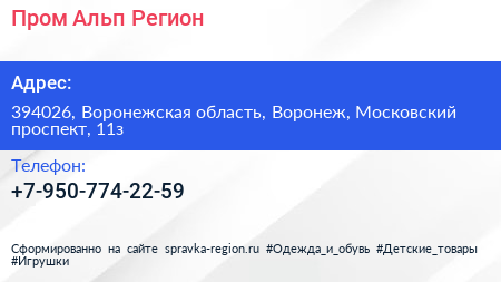 Пром-Альп-Регион по адресу 394026, Воронежская область, Воронеж, Московский проспект, 11з в дальнейшем Организация, размещена в следующих категориях: