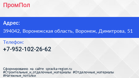 ПромПол по адресу 394042, Воронежская область, Воронеж, Димитрова, 51 в дальнейшем Организация, размещена в следующих категориях: