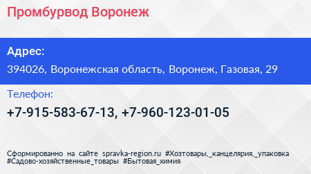Промбурвод-Воронеж по адресу 394026, Воронежская область, Воронеж, Газовая, 29 в дальнейшем Организация, размещена в следующих категориях: