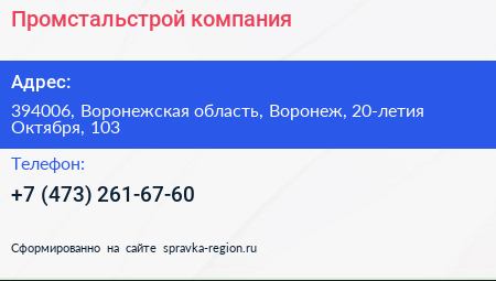 Промстальстрой, компания по адресу 394006, Воронежская область, Воронеж, 20-летия Октября, 103 в дальнейшем Организация, размещена в следующих категориях: