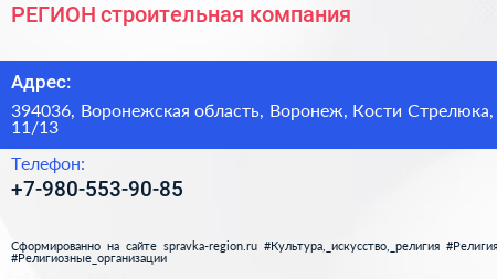 РЕГИОН, строительная компания по адресу 394036, Воронежская область, Воронеж, Кости Стрелюка, 11/13 в дальнейшем Организация, размещена в следующих категориях: