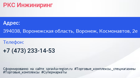 РКС-Инжиниринг по адресу 394038, Воронежская область, Воронеж, Космонавтов, 2е в дальнейшем Организация, размещена в следующих категориях:
