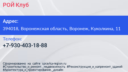 РОЙ Клуб по адресу 394018, Воронежская область, Воронеж, Куколкина, 11 в дальнейшем Организация, размещена в следующих категориях: