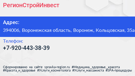 РегионСтройИнвест по адресу 394006, Воронежская область, Воронеж, Кольцовская, 35а в дальнейшем Организация, размещена в следующих категориях: