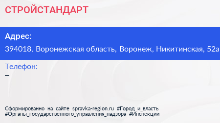 СТРОЙСТАНДАРТ по адресу 394018, Воронежская область, Воронеж, Никитинская, 52а в дальнейшем Организация, размещена в следующих категориях: