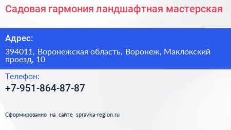 Садовая гармония, ландшафтная мастерская по адресу 394011, Воронежская область, Воронеж, Маклокский проезд, 10 в дальнейшем Организация, размещена в следующих категориях: