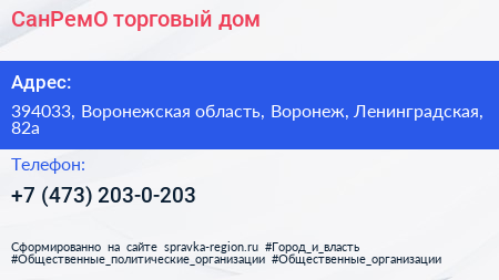 СанРемО, торговый дом по адресу 394033, Воронежская область, Воронеж, Ленинградская, 82а в дальнейшем Организация, размещена в следующих категориях:
