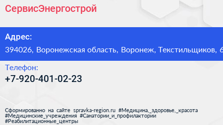 СервисЭнергострой по адресу 394026, Воронежская область, Воронеж, Текстильщиков, 6 в дальнейшем Организация, размещена в следующих категориях: