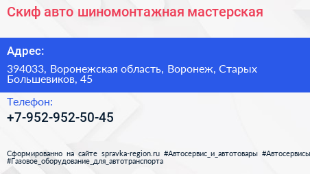 Скиф-авто, шиномонтажная мастерская по адресу 394033, Воронежская область, Воронеж, Старых Большевиков, 45 в дальнейшем Организация, размещена в следующих категориях: