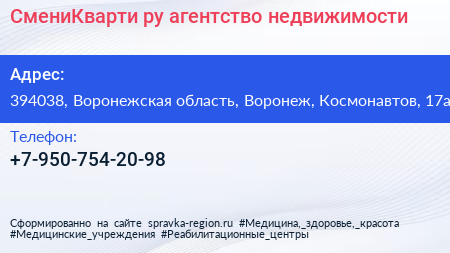 СмениКварти.ру, агентство недвижимости по адресу 394038, Воронежская область, Воронеж, Космонавтов, 17а в дальнейшем Организация, размещена в следующих категориях: