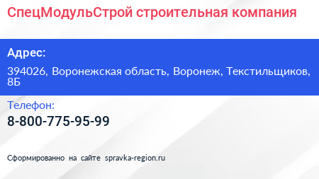 СпецМодульСтрой, строительная компания по адресу 394026, Воронежская область, Воронеж, Текстильщиков, 8Б в дальнейшем Организация, размещена в следующих категориях: